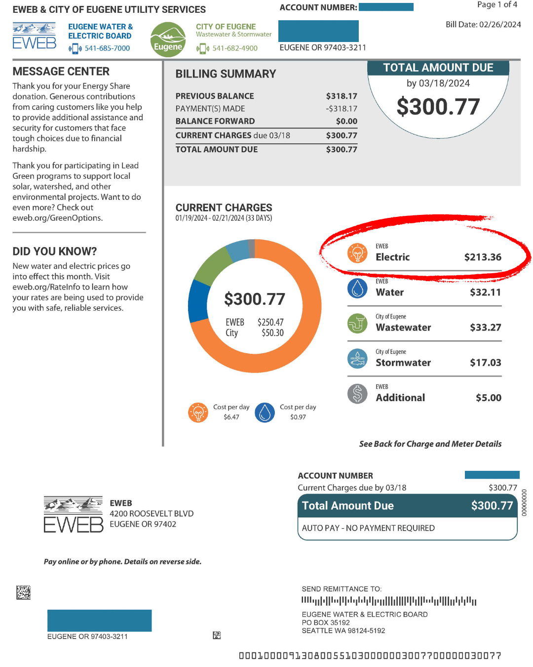 Personalizamos su sistema de paneles solares para producir la mayoría de las necesidades energéticas de su familia. ¡Esto cortó sus facturas de energía Eweb de $ 200+ y les ahorrará miles por año! Y como Oregon Las compañías de servicios públicos aumentan las tarifas año tras año, Monte y su familia ahorrarán aún más!